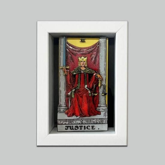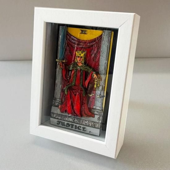 タロットカード大アルカナ「正義」を立体的に再現した、写真立て風のシャドーボックス。