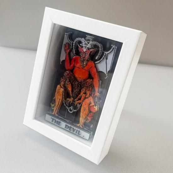 タロットカード大アルカナ「悪魔」を立体的に再現した、写真立て風のシャドーボックス。