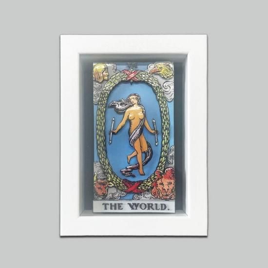 タロットカード大アルカナ「世界」を立体的に再現した、写真立て風のシャドーボックス。